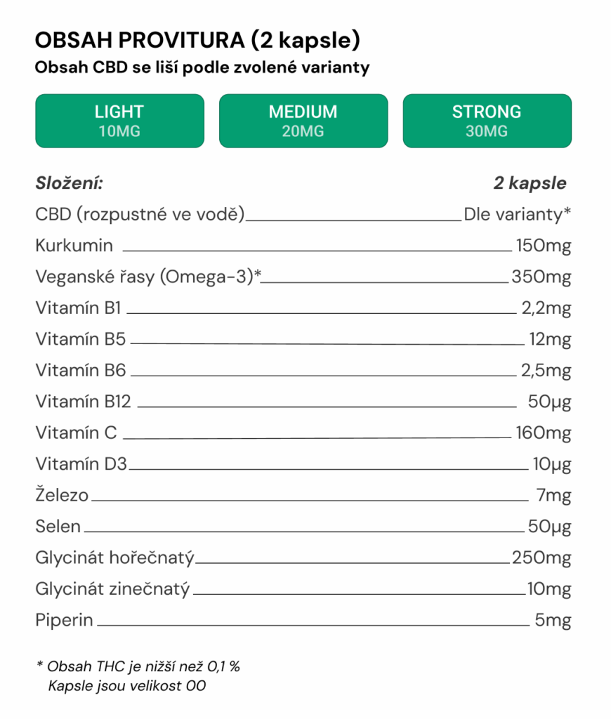 Provituru jsme naplnili pečlivě vybranými složkami od vitamínů, minerálů a omega-3 až po rostlinné extrakty, jako je CBD, kurkumin a piperin. Zde se dozvíte, co jednotlivé složky dělají a jaké jsou jejich potenciální přínosy, na které upozornil výzkum.